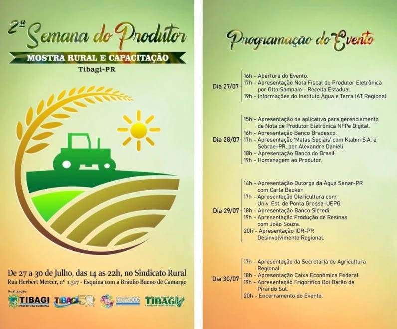 A cerimônia de abertura está marcada para as 16h e contará com participação de autoridades e da população em geral. O evento é aberto ao público, sem cobrança de ingressos. Confira abaixo a programação completa da 2ª Semana do Produtor de Tibagi.