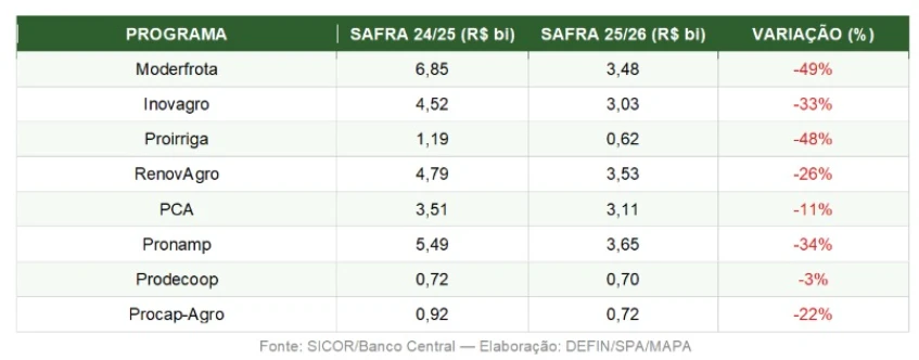 Os principais programas de investimento acumularam recuos em relação à safra 2024/2025. O Moderfrota liderou as quedas, com retração de 49%, passando de R$ 6,85 bilhões para R$ 3,48 bilhões.
