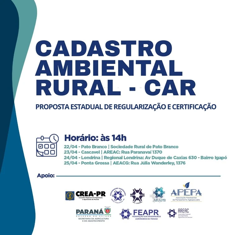 “Cadastro Ambiental Rural e Proposta Estadual de Regularização e Certificação”, que está sendo realizada nos dias 22, 23, 24 e 25 de abril de 2025 em diferentes cidades do Paraná.