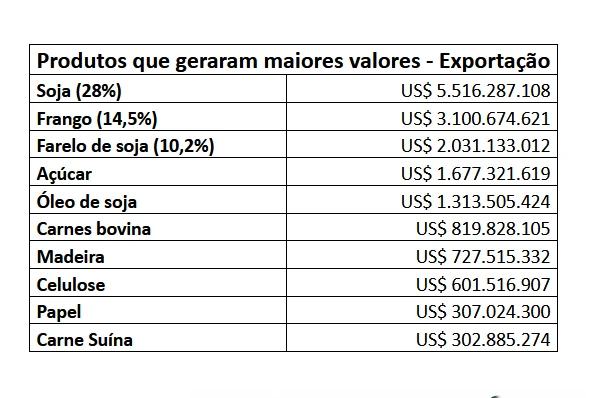 Outros itens de destaque que geraram receitas às exportações pelos portos de Paranaguá e Antonina foram o complexo sucroalcooleiro (US$ 1,75 bilhão) e os produtos florestais (US$ 1,63 bilhão).
