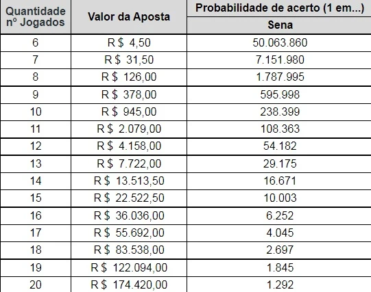 O quadro abaixo traz a probabilidade de acerto em relação à quantidade de números jogados e o valor da aposta da Mega-Sena: