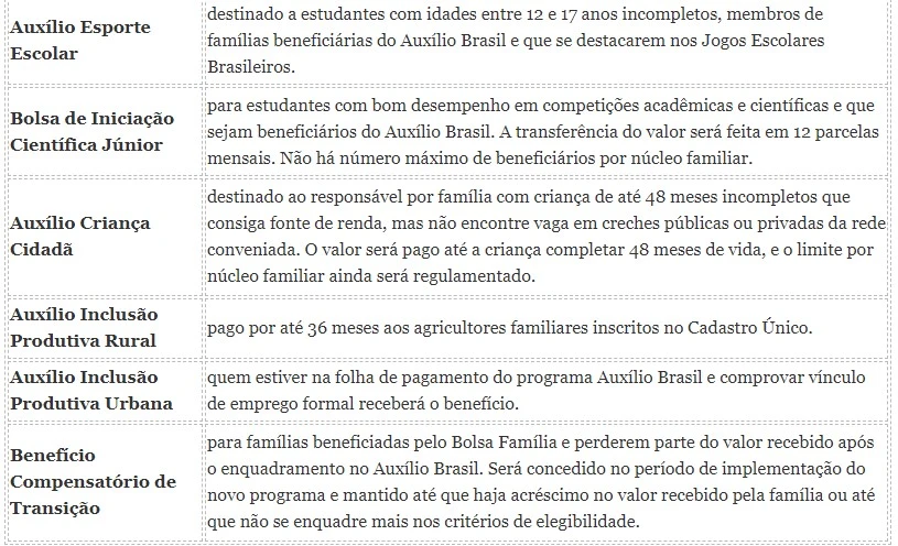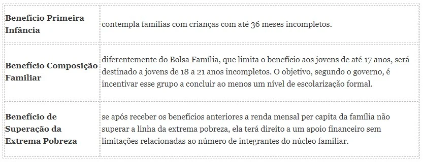 Chamado de Auxílio Brasil, o novo programa social que pretende substituir o Bolsa Família tem três modalidades de benefício básico: para primeira infância, para famílias com jovens de até 21 anos de idade e para a complementação para famílias que não conseguirem sair da extrema pobreza mesmo após receber os benefícios anteriores. Os valores só serão definidos no fim de setembro.