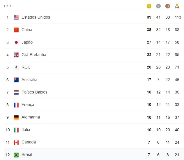 O Brasil conquistou 21 pódios, um recorde, superando a marca de 19 da Rio 2016, quando o país conquistou sete ouros, mesmo número de títulos faturados em Tóquio. No ranking pelo número total de medalhas, o Brasil também foi o 12º colocado com 21 medalhas, três a menos que o Canadá, mas uma a mais que Hungria, Nova Zelândia e Coreia do Sul.
