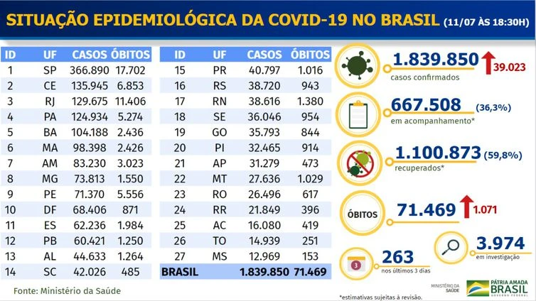 Segundo o Painel Coronavírus, foram registrados 39.023 casos nas últimas 24 horas. O número de casos confirmados desde o início da pandemia chegou a 1.839.850.