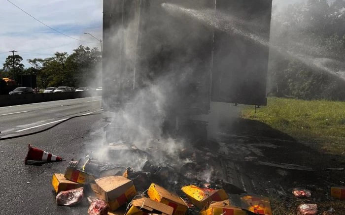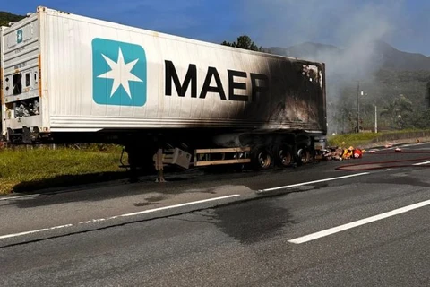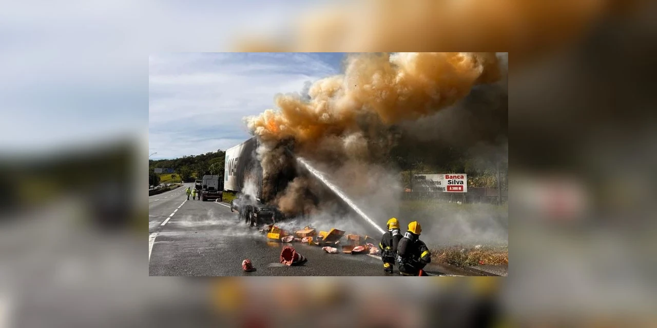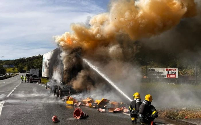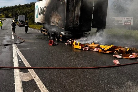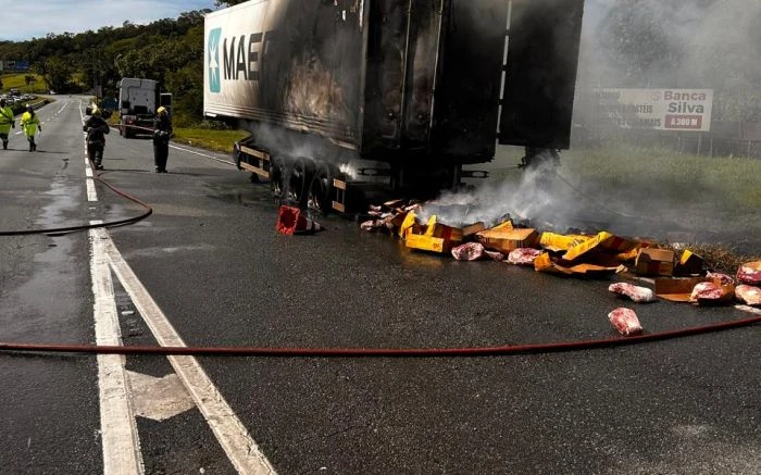 Um furgão frigorífico carregado com carne foi tomado pelo fogo, na manhã deste domingo (28), na praça de pedágio de Garuva, no Norte Catarinense, próximo da divisa com o Paraná, na BR-101, trecho percorrido por muitos paranaenses que se dirigem ao litoral de Santa Catarina para as festividades de fim de ano.
