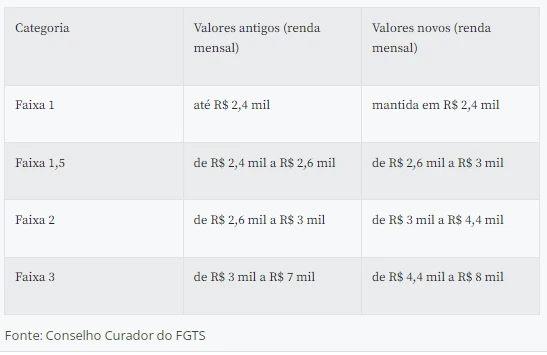 Cada faixa tem subsídios e programas diferenciados. Segundo o Conselho Curador do FGTS, a atualização das faixas de renda tem como objetivo destravar o programa habitacional e melhorar as condições para as construtoras, pressionadas pelo aumento dos custos, pelos juros altos e pela inadimplência.