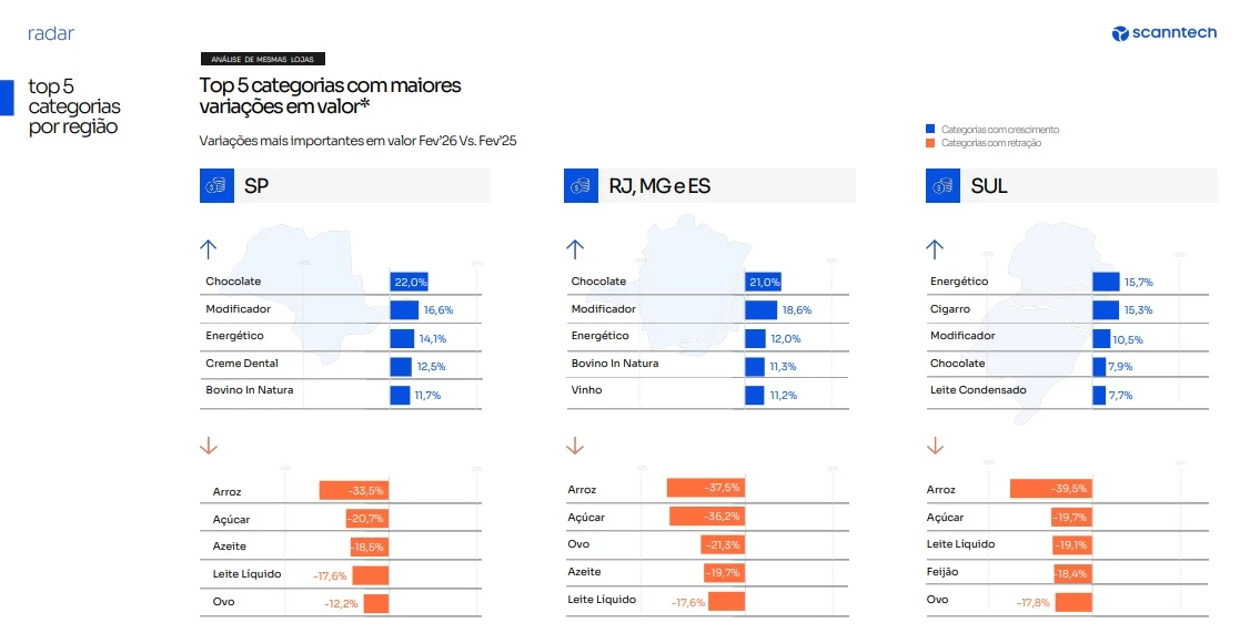 Os resultados aparecem em um contexto de desempenho mais moderado do varejo alimentar. Segundo o relatório, a região Sul registrou queda no consumo de arroz (39,5%), açúcar (19,7%), leite líquido (19,1%), feijão (18,4%) e ovo (17,8%).