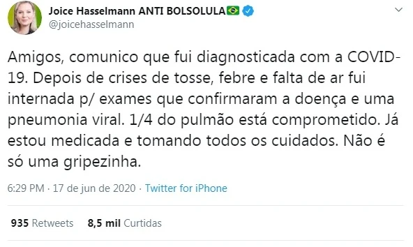 Na noite desta quarta-feira (17), a deputada federal Joice Hasselmann postou através do Twitter uma mensagem afirmando ter sido diagnosticada com Covid-19.