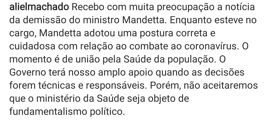 Já o deputado federal Aliel Machado (PSB), demonstrou preocupação com a demissão de Mandetta e pediu a união de todos pela saúde da população.