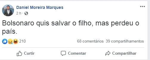 Após a saída de Sérgio Moro do Ministério da Justiça e Segurança Pública nesta sexta-feira (24), o ex-comandante de infantaria do 13º Batalhão de Infantaria Blindada (13º BIB) de Ponta Grossa, Daniel Moreira Marques, disse através de uma rede social que "Bolsonaro quis salvar o filho, mas perdeu o país", referindo-se a saída de Moro ocorrida na manhã desta sexta-feira (24).