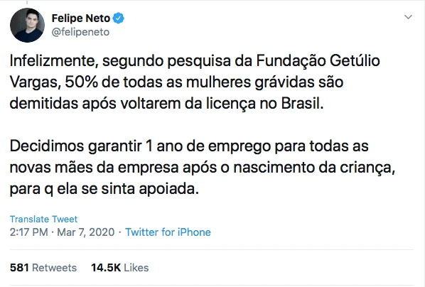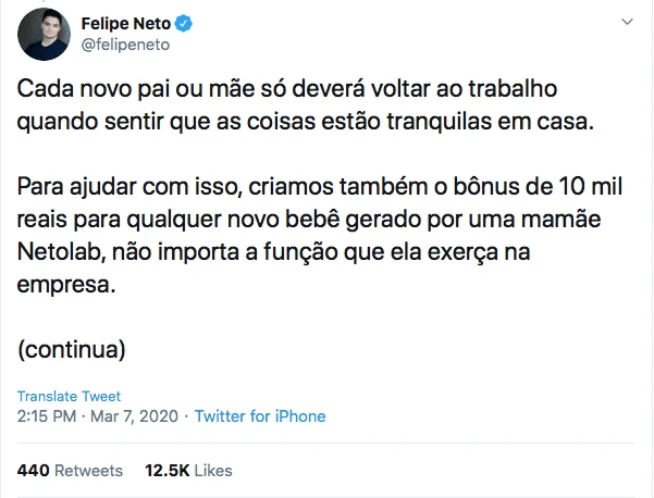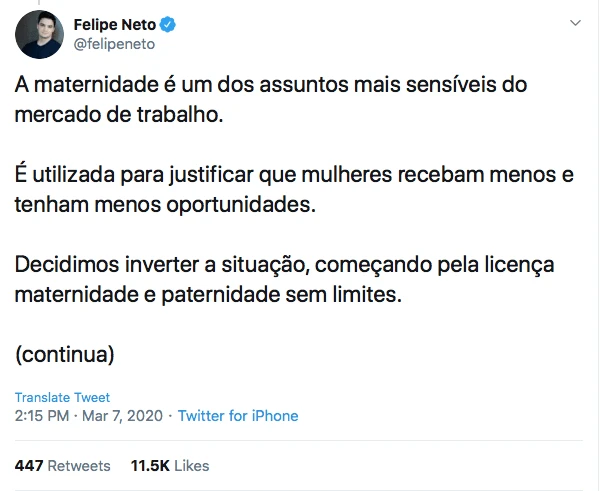 No Twitter, Felipe Neto comentou a decisão dizendo que 'a maternidade é um dos assuntos mais sensíveis do mercado de trabalho. É utilizada para justificar que mulheres recebam menos e tenham menos oportunidades", alfinetou. Ele acrescentou que decidiu inverter a situação, começando pela licença maternidade e paternidade sem limites. "Cada novo pai ou mãe só deverá voltar ao trabalho quando sentir que as coisas estão tranquilas em casa. Para ajudar com isso, criamos também o bônus de 10 mil reais para qualquer novo bebê gerado por uma mamãe Netolab, não importa a função que ela exerça na empresa", explicou. O youtube também lembrou que, segundo pesquisa da Fundação Getúlio Vargas, 50% de todas as mulheres grávidas são demitidas após voltarem da licença no Brasil. Confira as postagens: