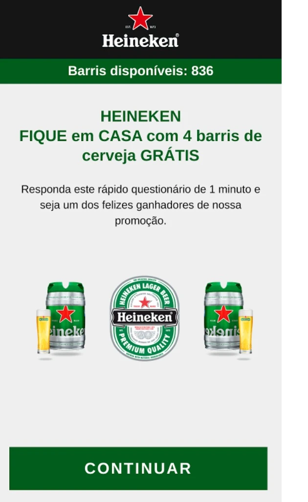 Um novo golpe que circula pelo WhatsApp promete quatro barris de cerveja grátis e está se espalhando rapidamente. De acordo com o PSafe, laboratório especializado em segurança digital, os criminosos usam o nome da Heineken e já fizeram 159 mil vítimas.
