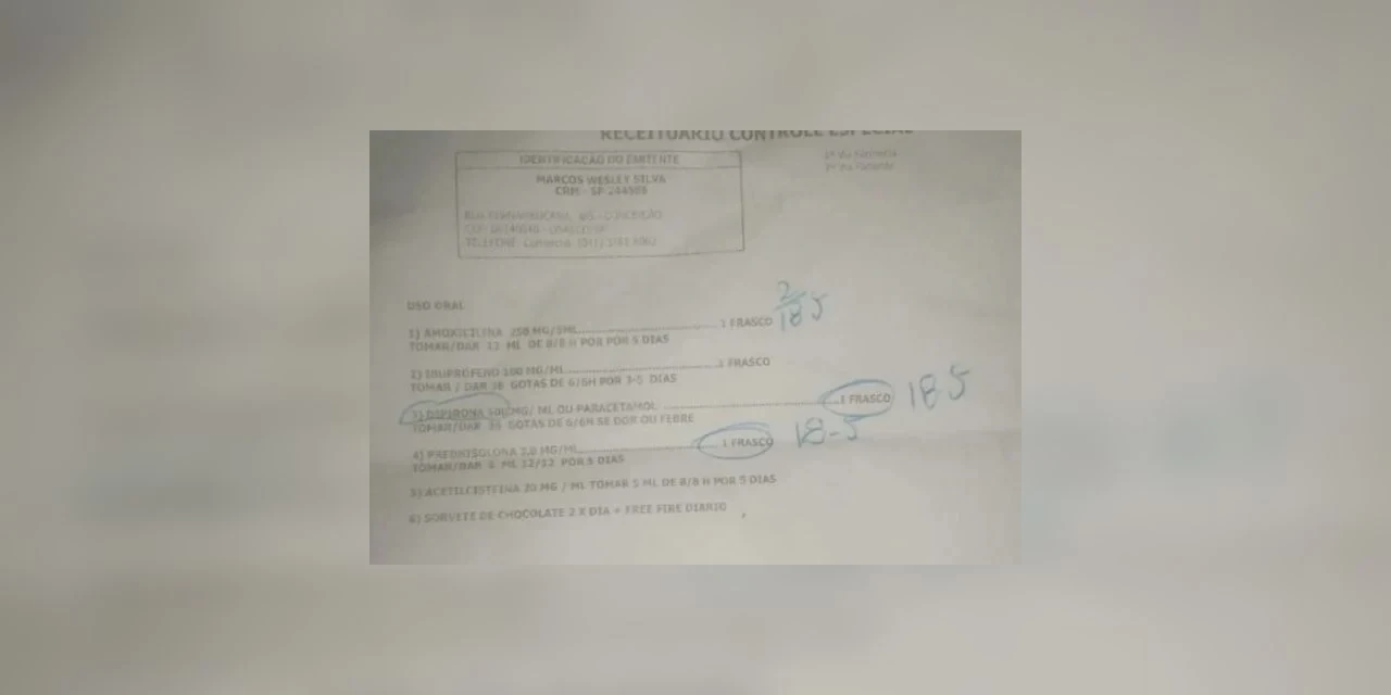 Além de “sorvete de chocolate 2x por dia” e “Free Fire Diário”, o médico prescreveu amoxicilina, ibuprofeno, dipirona, prednisolona e acetilcisteína.