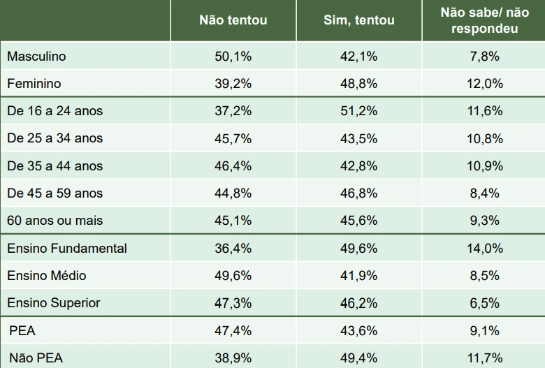 Entre os homens, 50,1% acham que não houve tentativa de golpe enquanto que 42,1% consideram que ela ocorreu. Já entre as mulheres, o número das que acreditam que o ex-presidente estaria envolvido no crime é de 48,8%.