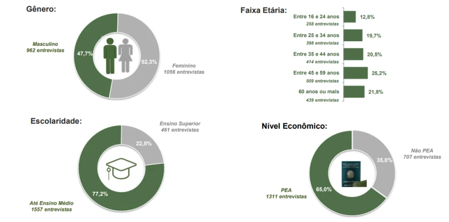 A coleta de dados ocorreu entre os dias 7 e 10 de janeiro de 2025, abrangendo 2018 eleitores de diversas regiões do país. Segundo o Paraná Pesquisas, a amostra apresenta um grau de confiança de 95%, com margem de erro de 2,2 pontos percentuais nos resultados gerais. O perfil dos entrevistados está detalhado a seguir: