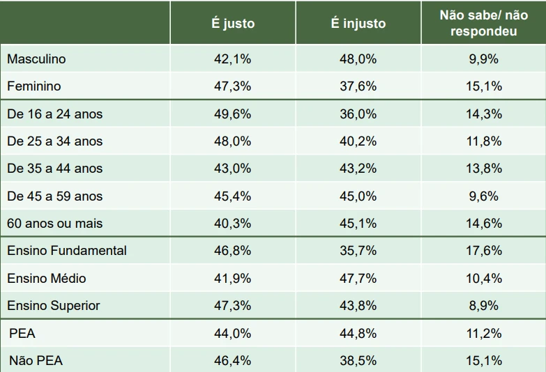 Especificando os dados, o Paraná Pesquisas mostra que 47,3% do público feminino considera o processo justo, enquanto que 37,6% acham injusto - não sabe/não respondeu registrou 15,1%. Já entre os homens, 42,1% vê a investigação como justa e 48% como injusta - não sabe/não respondeu obteve 9,9%.