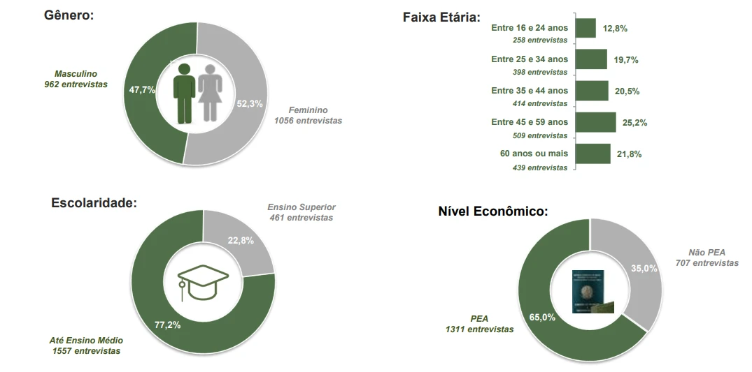 A coleta de dados foi realizada entre os dias 07 e 10 de janeiro de 2025. No total foram entrevistados 2018 eleitores de todo o território nacional. De acordo com o Paraná Pesquisas, a amostra tem grau de confiança de 95% para uma margem de erro de 2,2 pontos percentuais para os resultados gerais. O perfil dos entrevistados pode ser visto abaixo:
