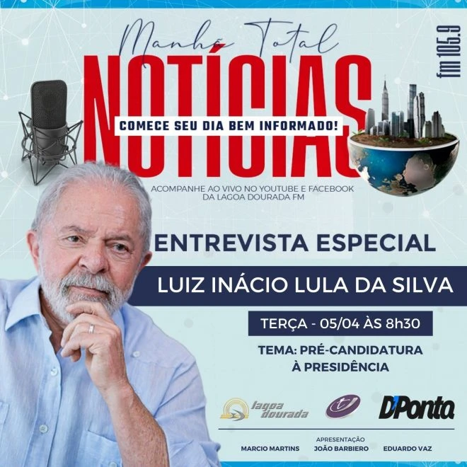 exclusiva será veiculada pela Rádio Lagoa Dourada FM 105,9, pelas redes sociais, pelo portal