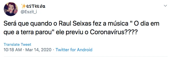 Nas redes sociais, o brasileiro está lidando com a pandemia de coronavírus da forma que sabe fazer melhor, ou seja, com memes. Com a recomendação da OMS para que as pessoas fiquem em casa e evitem aglomerações, internautas questionaram se a música 'O dia em que a Terra parou', do cantor Raul Seixas seria uma previsão. O assunto dominou o Twitter nesta manhã de domingo (15). Confira algumas postagens: