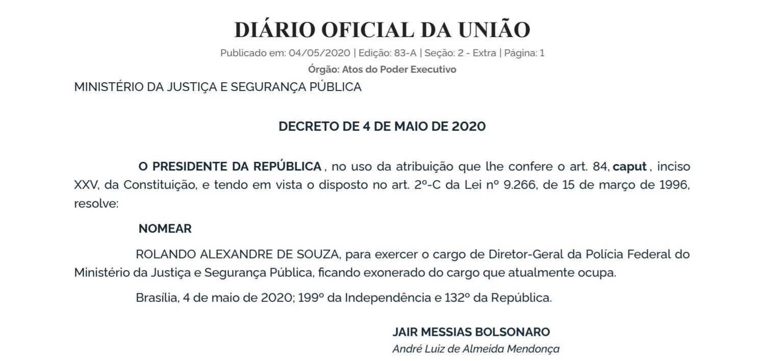 O presidente Jair Bolsonaro indicou Rolando Alexandre de Souza nesta segunda-feira (4) para assumir o cargo de diretor-geral da PF (Polícia Federal). O decreto foi assinado pelo presidente e pelo ministro da Justiça e Segurança Pública, André Mendonça.