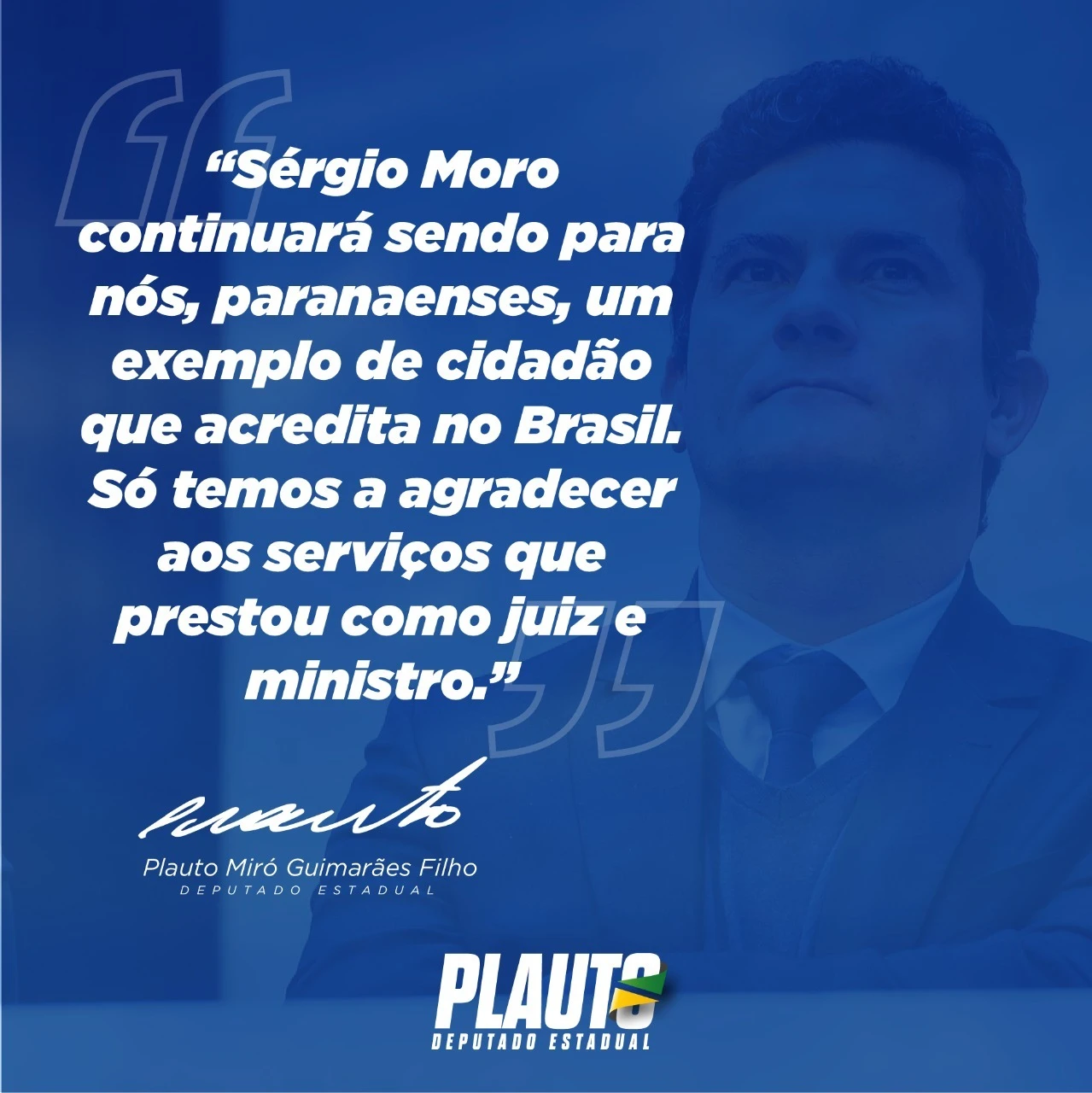 Após a saída de Sérgio Moro do Ministério da Justiça e Segurança Pública nesta sexta-feira (24), o deputado estadual Plauto Miró Guimarês (DEM), se pronunciou através de uma nota oficial dizendo que; "Sérgio Moro segue sendo um exemplo de cidadão para os paranaenses". O parlamentar disse também que; "só temos a agradecer aos serviços que prestou como juiz e ministro", completa Plauto.