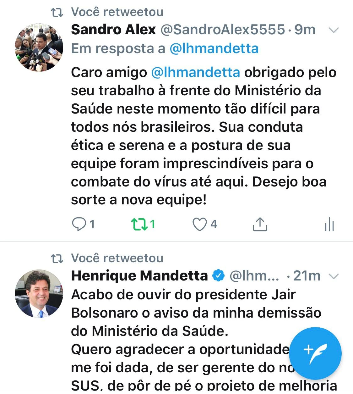 Autoridades de Ponta Grossa e do Paraná se manifestaram sobre a decisão. O secretário estadual de Infraestrutura e Logística, Sandro Alex, publicou em seu perfil no Twitter uma mensagem de despedida a Mandetta. Sandro agradeceu pelo trabalho do ministro e desejou boa sorte à nova equipe comandada por Teich.