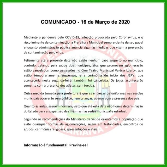 A Prefeitura Municipal de Jaguariaíva emitiu um comunicado postergando eventos que provocam aglomerações em prevenção à pandemia de coronavírus. Estão suspensas as sessões no Cine-Teatro Municipal Valéria Luercy e a abertura dos Jogos Estudantis Municipais foi cancelada. Os jogos acontecerão sem torcida.