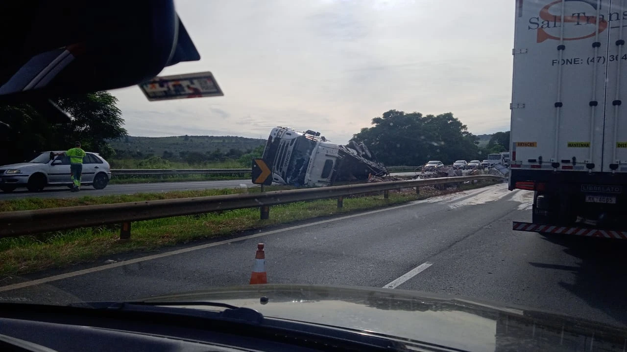 No acidente um caminhão Scania tombou sobre o canteiro central. O acidente foi registrado por volta das 7h40. Segundo a PRF, duas pessoas sofreram ferimentos leves. O caminhão transportava produto corrosivo, que oferece risco à saúde ao ser inalado: 13 toneladas de resina - matéria-prima para fabricação de tintas; mais duas toneladas de um produto corrosivo líquido (ONU 2801 - corante ou intermediário para corante).