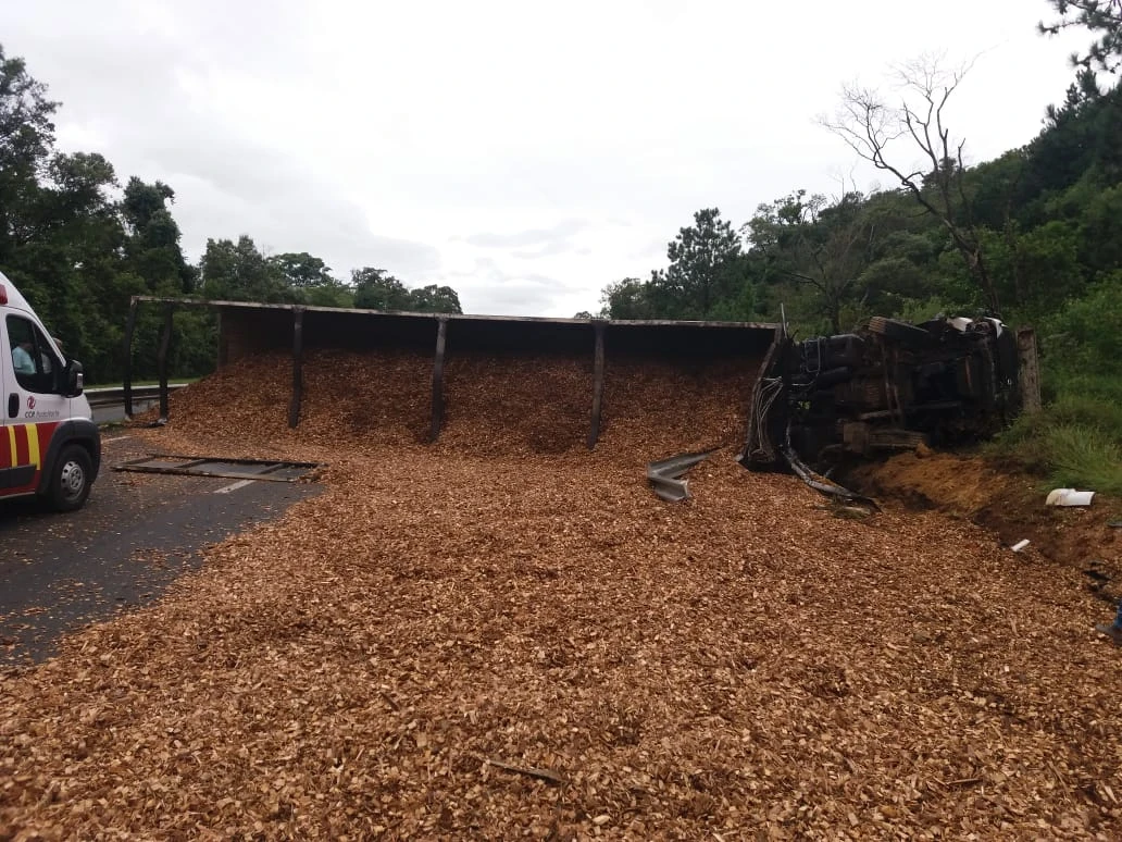 Nesta sexta (5), por volta das 16h40 na BR-376 km 445 em Tibagi, ocorreu um tombamento de um M. Benz Axor de Reseva/PR atrelado a um semirreboque carregado com cavaco de madeira.