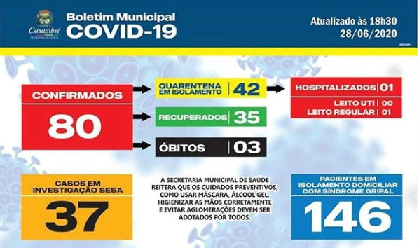 A Secretaria Municipal de Saúde, por meio da Vigilância Epidemiológica, divulgou nota informativa na tarde deste domingo (28) sobre o 80º caso confirmado de coronavírus Covid-19, resultado de exame IBMP: Paciente sexo feminino, 52 anos, diagnosticada intra-hospitalar, recebeu alta hospitalar no dia de hoje.