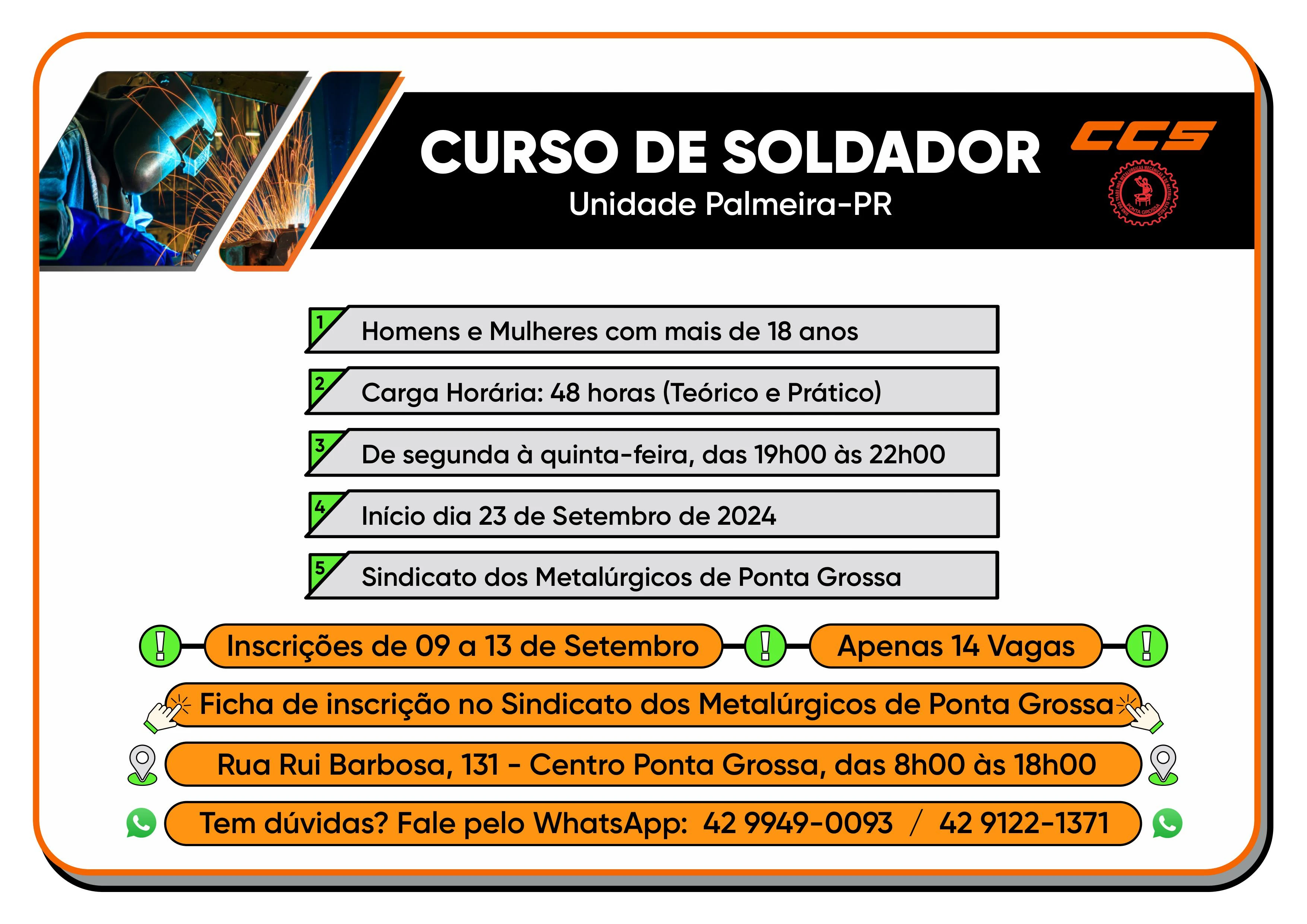 A CCS Tecnologia e Serviços está oferecendo uma oportunidade única de qualificação em parceria com a gestão Metalurgente do Sindicato dos Metalúrgicos de Ponta Grossa e Região, um Curso de Solda MIG/MAG.