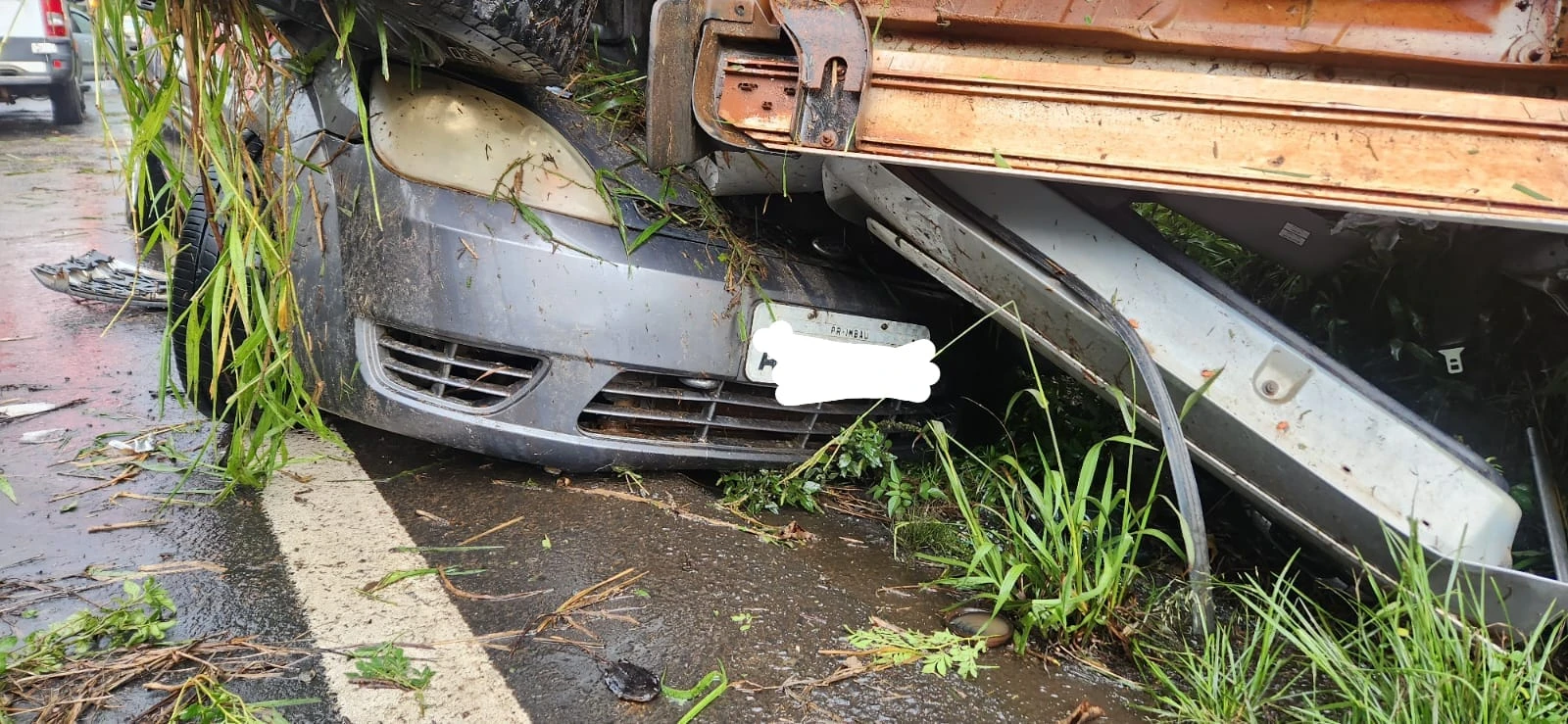 Depois da colisão entre os veículos, a caminhonete ficou tombada sobre o Fiesta. O ocupante da caminhonete ficou ferido e foi conduzido para atendimento hospitalar em Telêmaco Borba.