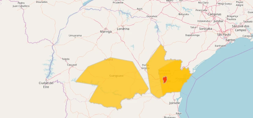 Para a região dos Campos Gerais e centro-sul do estado, o alerta é amarelo de severidade moderada com linhas de instabilidade atuando nas regiões, com risco de temporais, raios e ventos fortes. O aviso é válido até às 21h42.