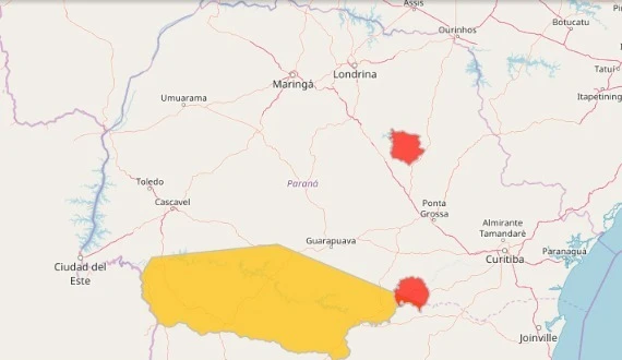 A Defesa Civil do Paraná emitiu um alerta amarelo para a região sudoeste do estado, onde podem ocorrer temporais com raios e ventos fortes. Para as cidades de Telêmaco Borba, São Mateus do Sul e municípios vizinhos , o alerta é vermelho para risco de desabamento nessas áreas e segue vigente até às 19h24.