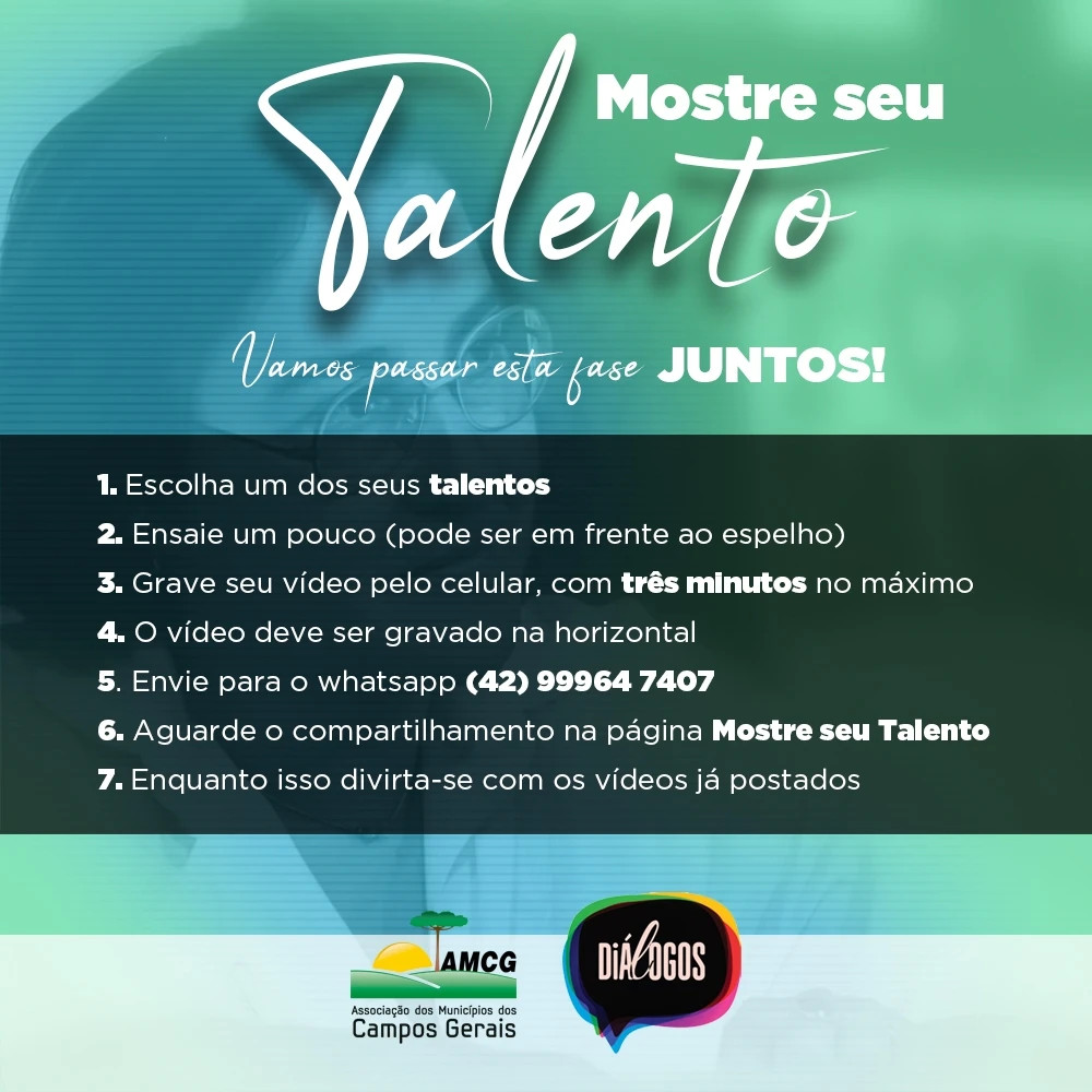 A Associação dos Municípios dos Campos Gerais (AMCG), em parceria com a Diálogos Culturais, acaba de lançar o projeto 'Mostre seu Talento'. Atendendo às recomendações de isolamento social, em razão da pandemia de coronavírus, as entidades estão propondo uma atividade para a população da terceira idade, que é a de maior risco no contágio da doença. "Montamos uma página no Facebook convidando os idosos a mostrar os seus talentos por meio de vídeos", explica a diretora da AMCG, Katiane Pires.