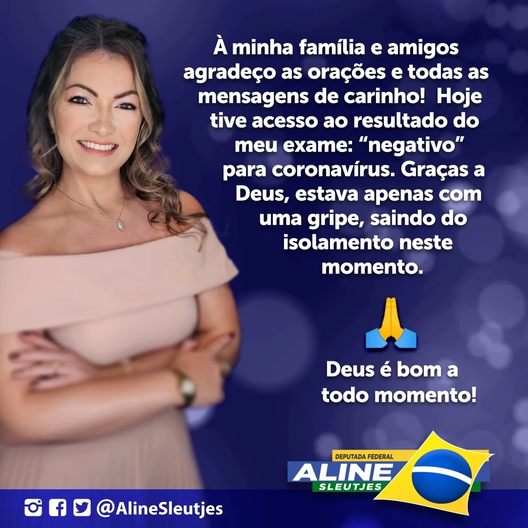 Na mensagem divulgada na tarde de hoje, a deputada agradece pelo teste ter resultado negativo. "À minha família e amigos agradeço as orações e mensagens de carinho. Graças a Deus estava apenas com uma gripe e estou saindo do isolamento neste momento", comemora Aline.
