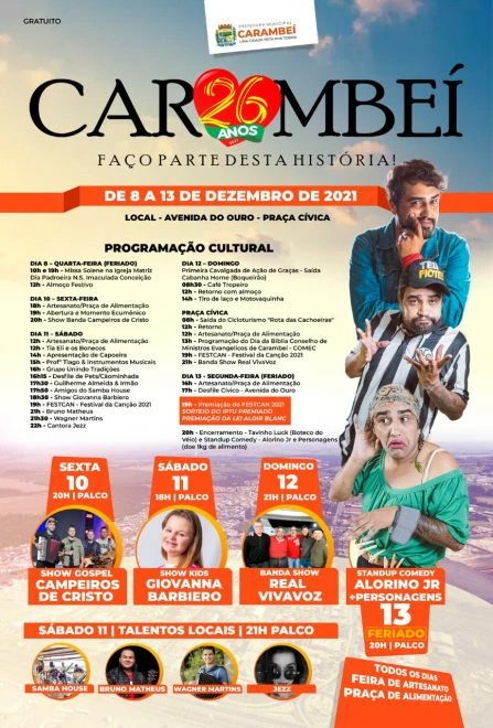 A administração municipal de Carambeí está reaproximando ainda mais a comunidade das iniciativas realizadas pelo governo municipal. E, para comemorar os 26 anos do município, a Prefeitura promove entre os dias 8 e 13 de dezembro um evento com apresentações culturais, missa solene, almoço, entre outras ações.