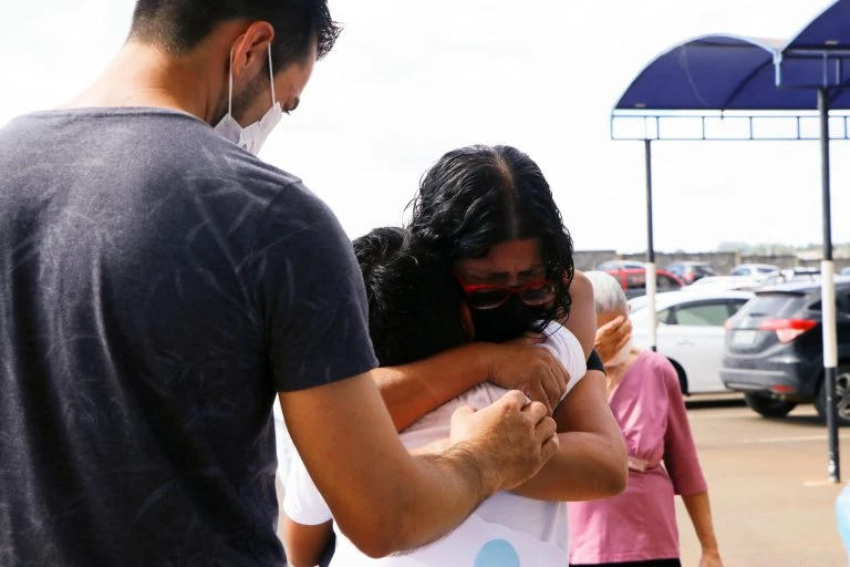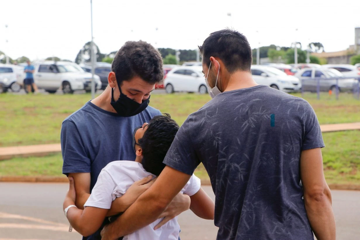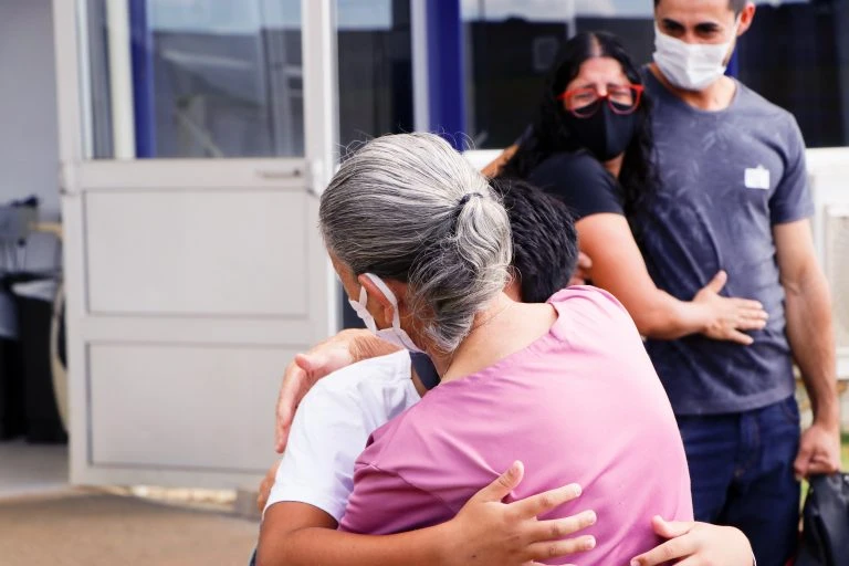 Breno foi recebido, na saída do hospital, pelos familiares mais próximos, que comemoravam a vida com balões azuis e cartazes. Não podia abraçar, mas não havia como conter o abraço apertado de uma criança na mãe, na avó, nos primos.
