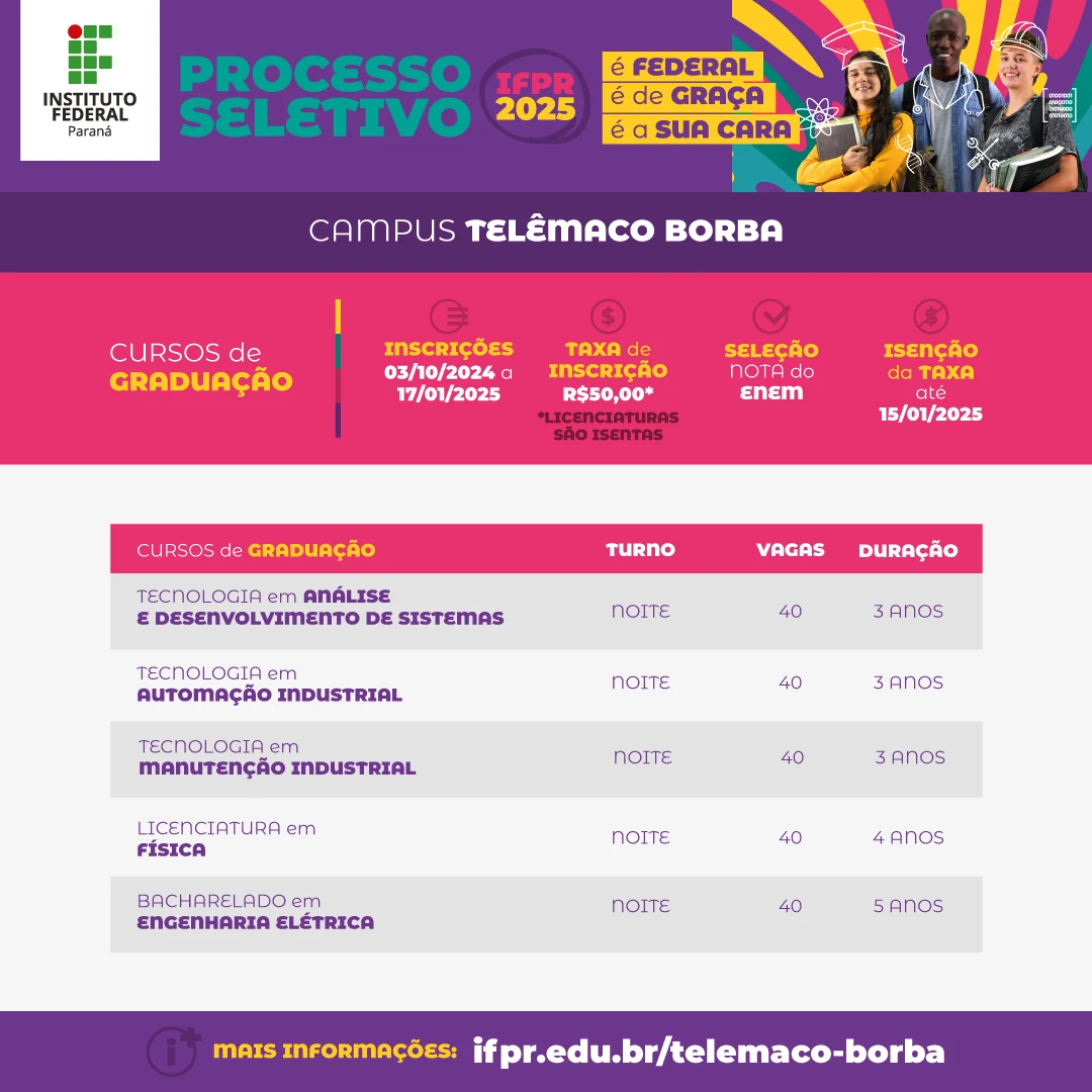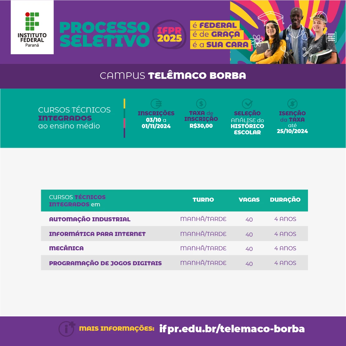 Nesta quinta-feira (03) foram abertas inscrições para os cursos técnicos integrados ao ensino médio e de graduação do Processo Seletivo do IFPR 2024/2025. Ao todo serão ofertadas 360 vagas no IFPR Campus Telêmaco Borba.