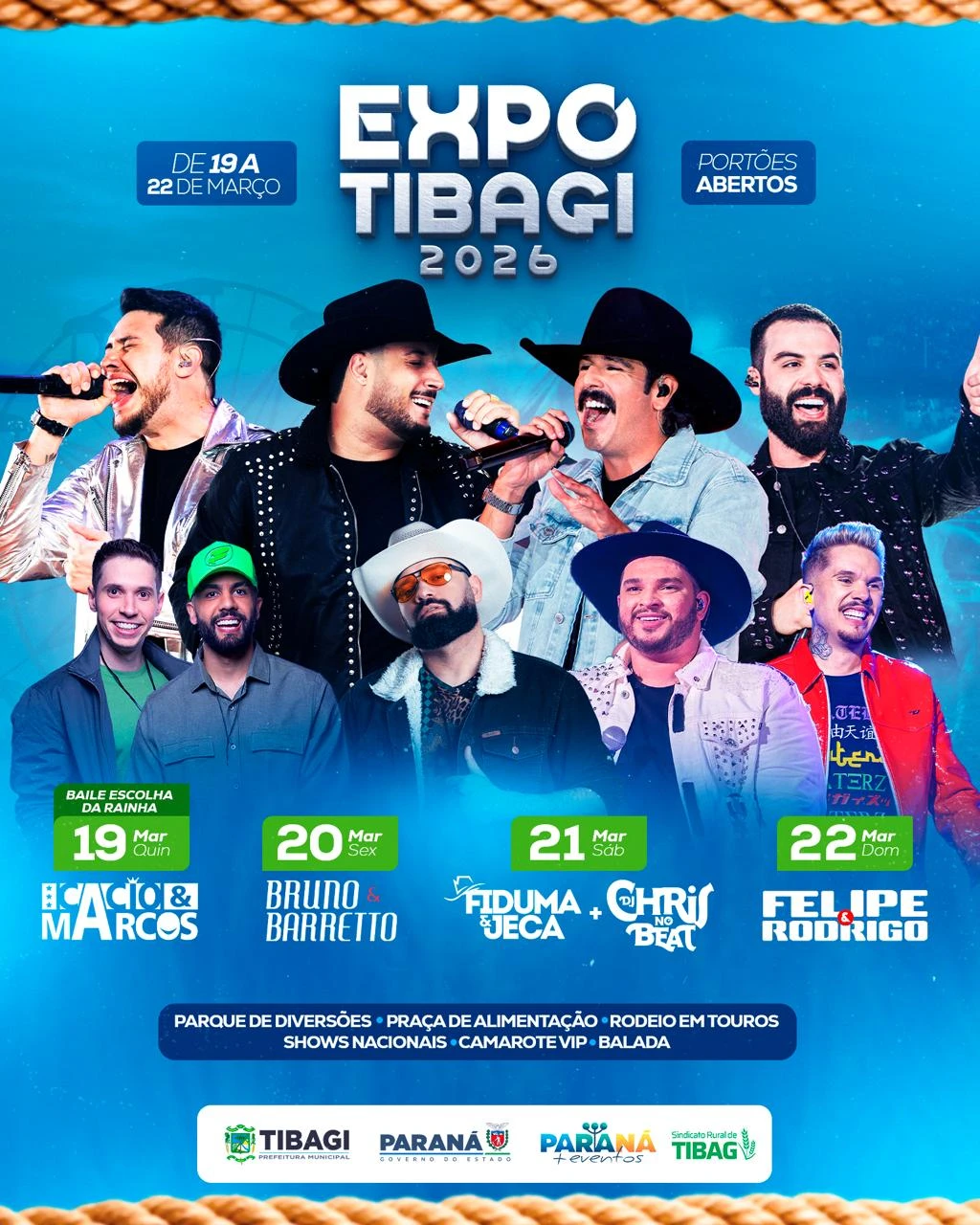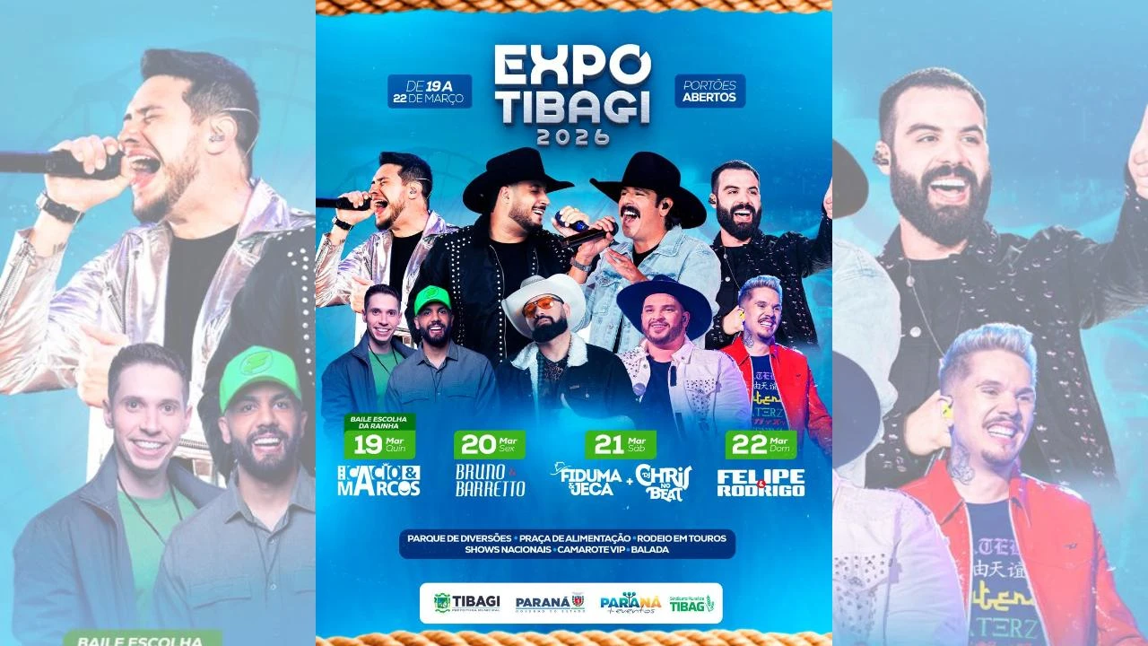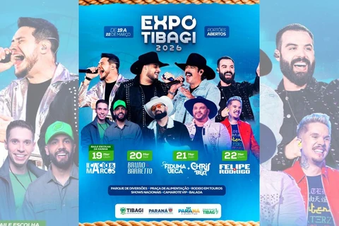 A abertura da Expo Tibagi 2026 conta com o baile e a escolha da Rainha da Expo 2026. Na sequência, acontece o show nacional com Cássio e Marcos.
