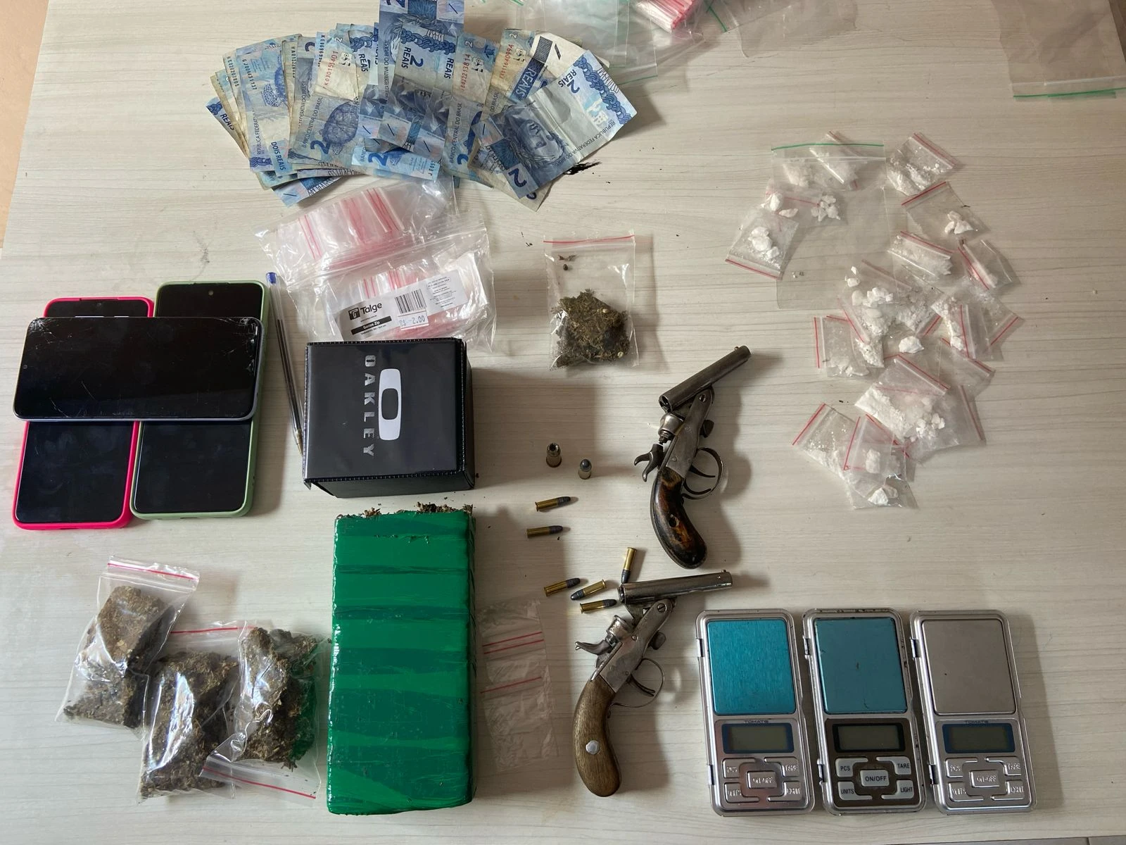 Quanto às drogas, armas e munições, foi lavrado auto de prisão em flagrante pelos crimes de tráfico de drogas e posse irregular de arma de fogo.