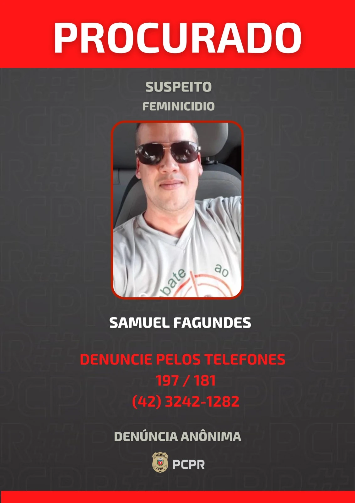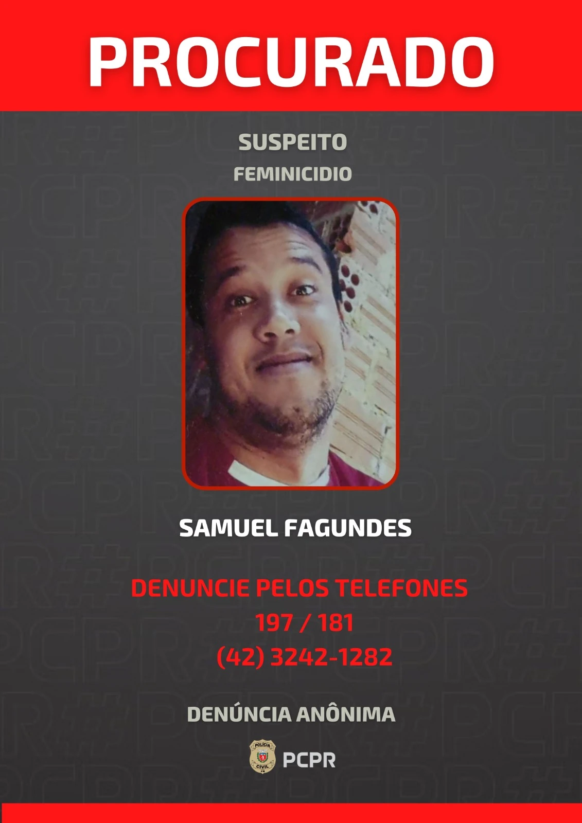 A Polícia Civil do Paraná (PCPR) divulga a foto de um homem, de 38 anos, suspeito do feminicídio que vitimou Luciane dos Santos, de 19.