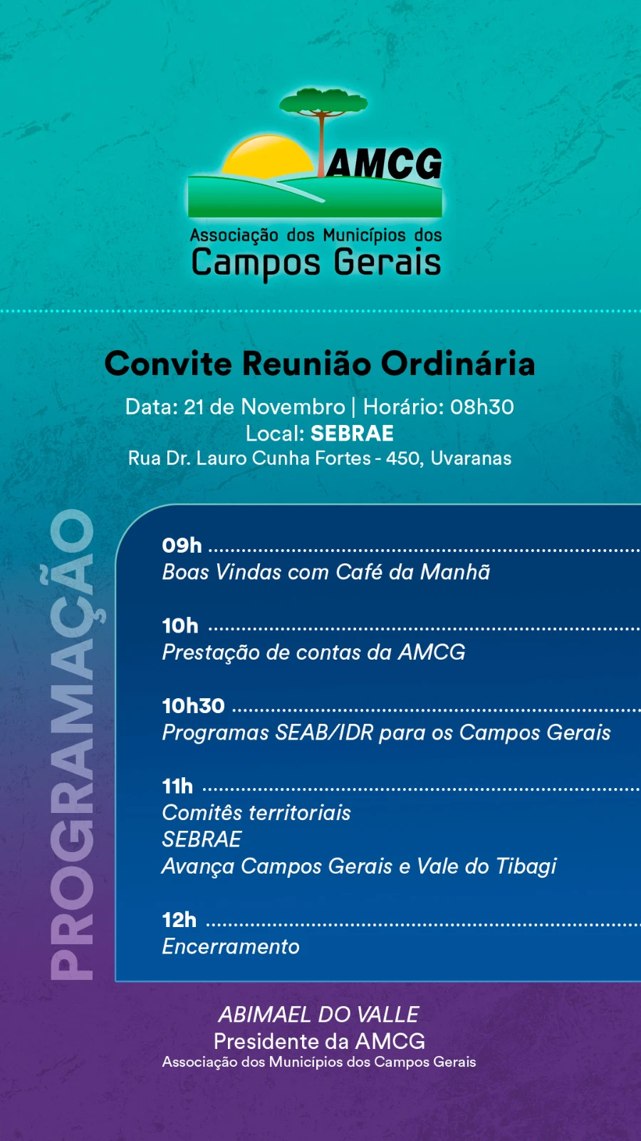 Abimael ainda reforçou a parceria junto à AMP. "Parabenizo o presidente da Associação dos Municípios do Paraná, Edimar Santos, pela iniciativa. A união e o diálogo entre as entidades sempre resultou em conquistas para os Campos Gerais. Ter essa representatividade a mais junto ao Estado é algo que contribui significativamente para o desenvolvimento dos nossos municípios", destacou. Além da AMCG, também estarão presentes no evento prefeitos de outras cinco associações regionais de municípios, entre elas: Assomec; Amcespar; Amsulpar; Amsulep e Amlipa.