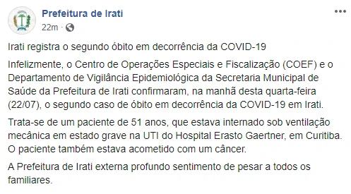 A Prefeitura Municipal de Irati, através das redes sociais, confirmou na manhã desta quarta-feira (22), o segundo óbito causado por Coronavírus registrado no município. A confirmação oficial ocorreu por parte do Centro de Operações Especiais e Fiscalização (COEF) e do Departamento de Vigilância Epidemiológica da Secretaria Municipal de Saúde de Irati. A vítima, um homem de 51 anos, estava internado na unidade de tratamento intensivo (UTI) do Hospital Erasto Gaertner, em Curitiba.