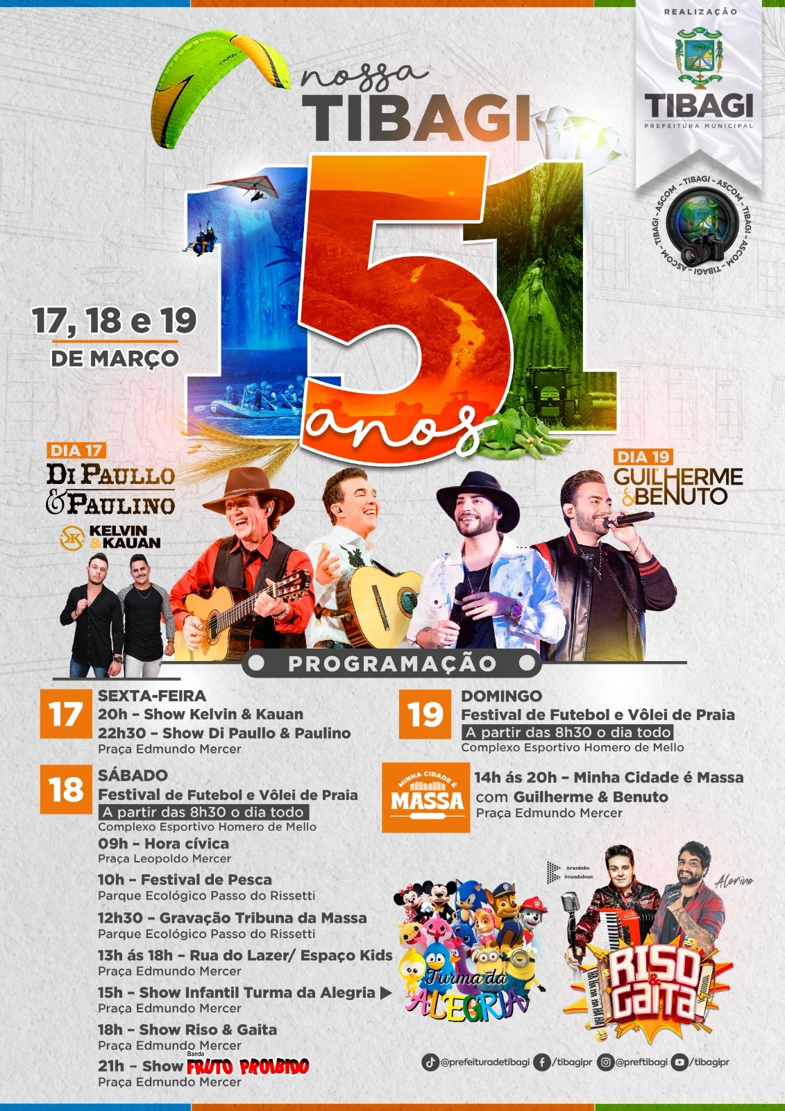 A programação completa com os horários previstos para cada atração você confere no Flyer da festa nas redes sociais e no site da Prefeitura de Tibagi.