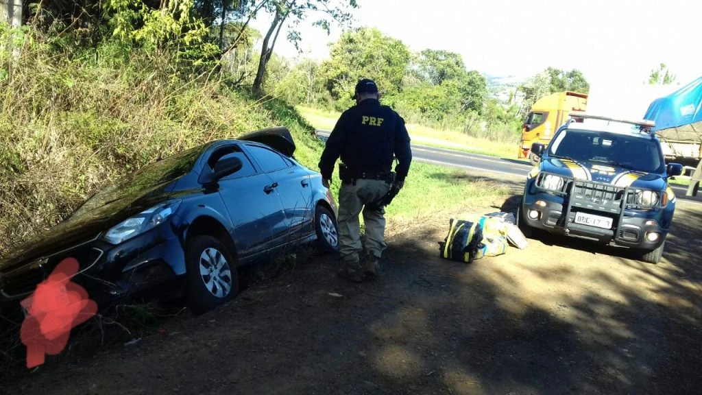 Diante disso, a equipe iniciou deslocamento a fim de proceder à abordagem do veículo, porém o mesmo não foi mais localizado. Iniciou-se, então, buscas entre os quilômetros 245 e 225, com apoio da Polícia Militar de Irati, ocasião na qual foi localizado o automóvel Chev/Onix Plus Joy, placas de Belo Horizonte/MG, tombado às margens da BR-277 no km 241, mas sem qualquer ocupante.