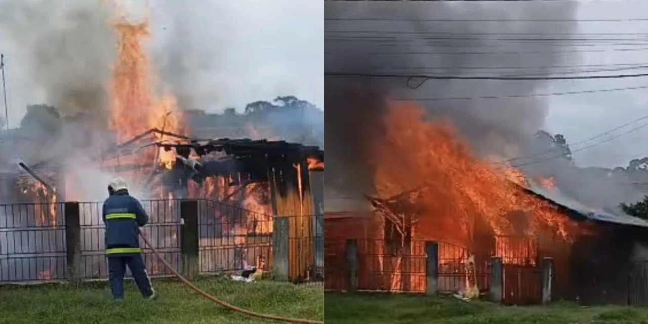 Um homem, de 48 anos, morreu carbonizado durante um incêndio no município de Prudentópolis, na tarde desta segunda-feira (23). Imagens do local mostram a casa, construída em madeira, tomada pelas chamas, enquanto as equipes do Corpo de Bombeiros tentam apagar o fogo.