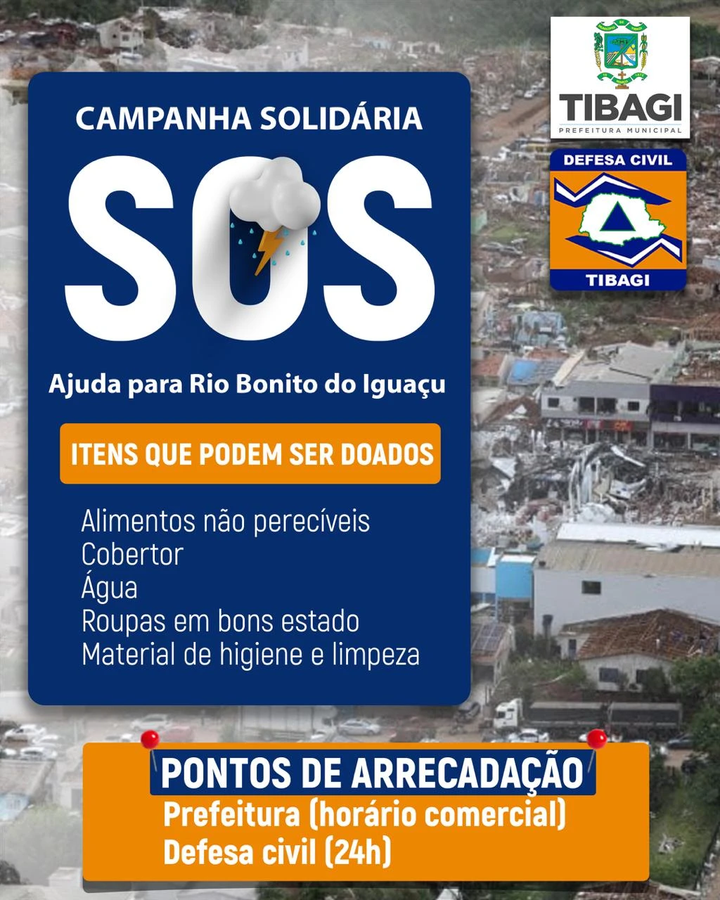 A Prefeitura de Tibagi iniciou uma campanha de arrecadação para auxiliar as famílias de Rio Bonito do Iguaçu, município do Paraná que foi devastado por um tornado com ventos de até 250 km/h. A tragédia deixou pelo menos cinco mortos e destruiu cerca de 90% da cidade, atingindo casas, comércios e prédios públicos, segundo o Coronel Hudson, secretário da Segurança Pública do Paraná.