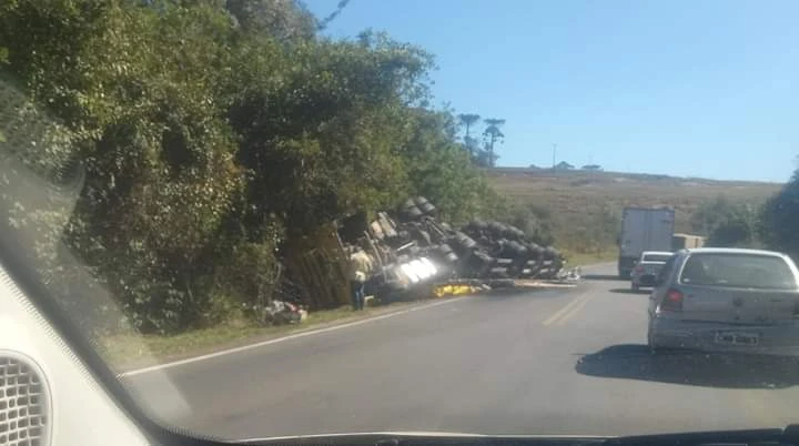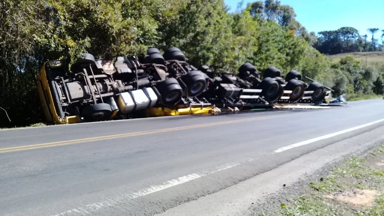 Na tarde desta quarta-feira (27), uma carreta carregada com madeira tombou na PR-151, no município de Palmeira.