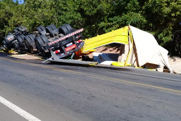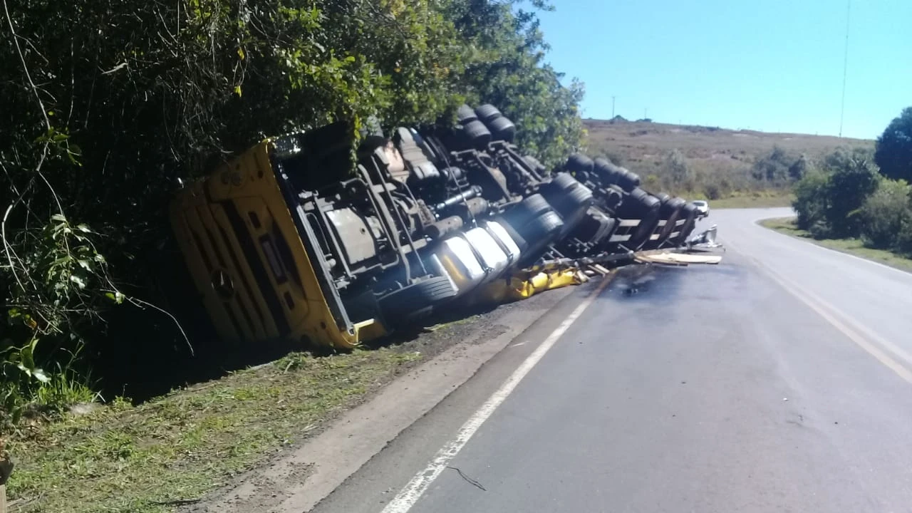 Segundo informações, uma segunda carreta teria invadido a pista de rodagem contrária e o primeiro motorista teria tentado desviar, quando perdeu o controle e tombou o veículo.